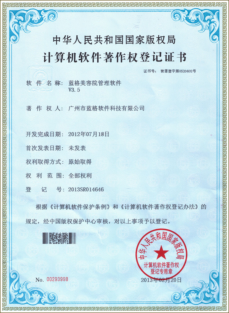 傲藍軟件認定證書 美容管理軟件著作權證書
