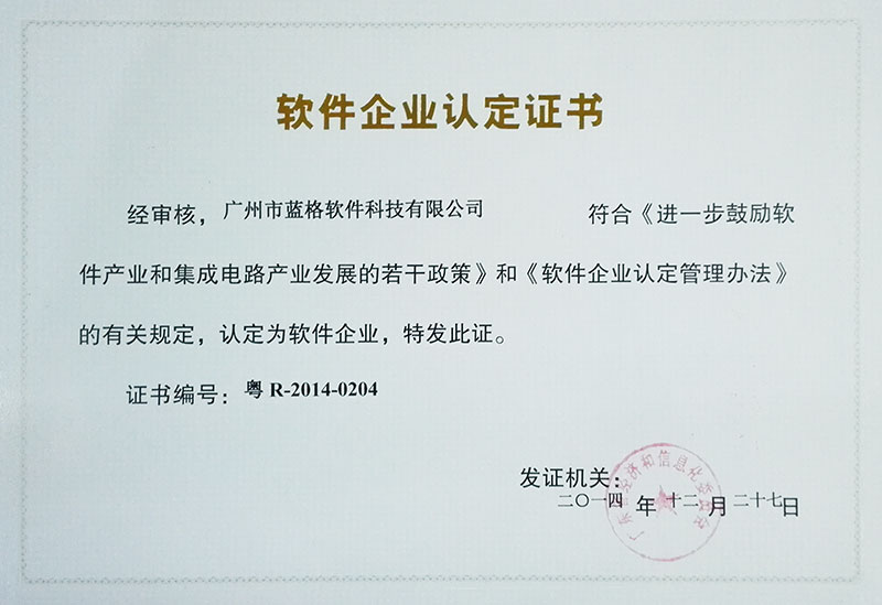 傲藍軟件企業認定證書